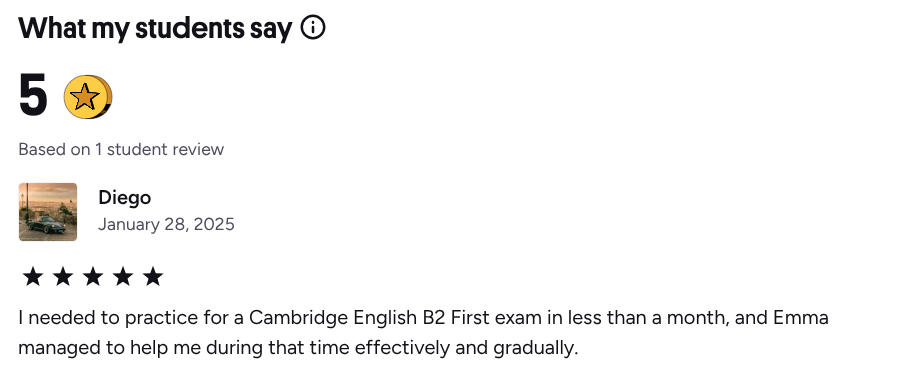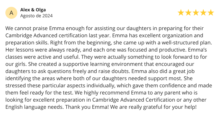 I am a Trinity College-certified native English Teacher with a Masters Degree in English Literature. My experience includes Cambridge C1 Advanced and B2 First Certificate preparation, preparing and grading mock exams, exam invigilation (so I can tell you exactly what exam conditions are like), and general conversation classes.