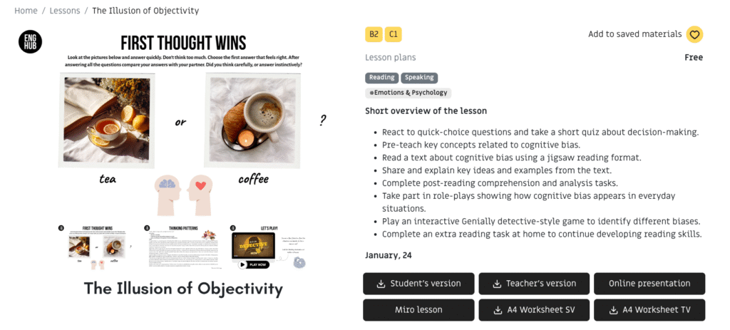 This is by far my favourite ESL lesson plan website for teenagers and adult students. Not only are the designs of the lesson materials clean, inclusive and beautiful, but they cover so many different topics, particularly for upper intermediate and advanced students. They have plenty of warmer activities and complete lesson plans that include games, presentations, and pdfs. They are aesthetically pleasing and it’s the only ESL lesson plan website where the lessons, in my opinion, need no adjustment whatsoever. If you work online for the majority of the time (which I do), it’s perfect.